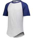 Augusta Adult 4.8 ounce Short Sleeve 50/50 Cotton/Poly Baseball Jersey. Polyester/cotton jersey knit blend fabric. Crew neck. Contrast color neck and sleeves for added style. Raglan sleeves for maximum mobility and comfort. Serged fishtail bottom for added length.