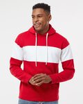 J-America Adult Varsity Fleece Hooded Pullover. 8 ounce 60/40% cotton poly sueded fleece. Contrast self fabric hood, chest and sleeve panels. Set on pouch pocket. Rib cuffs and hem.